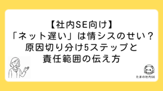 「ネット遅い」と言われた社内SE向けに、原因切り分け5ステップと責任範囲を明確にする伝え方を解説。PC側・社内NW・ISP・サービス側の4分類で問題を特定し、情シスのせいにされない対応術を紹介します。