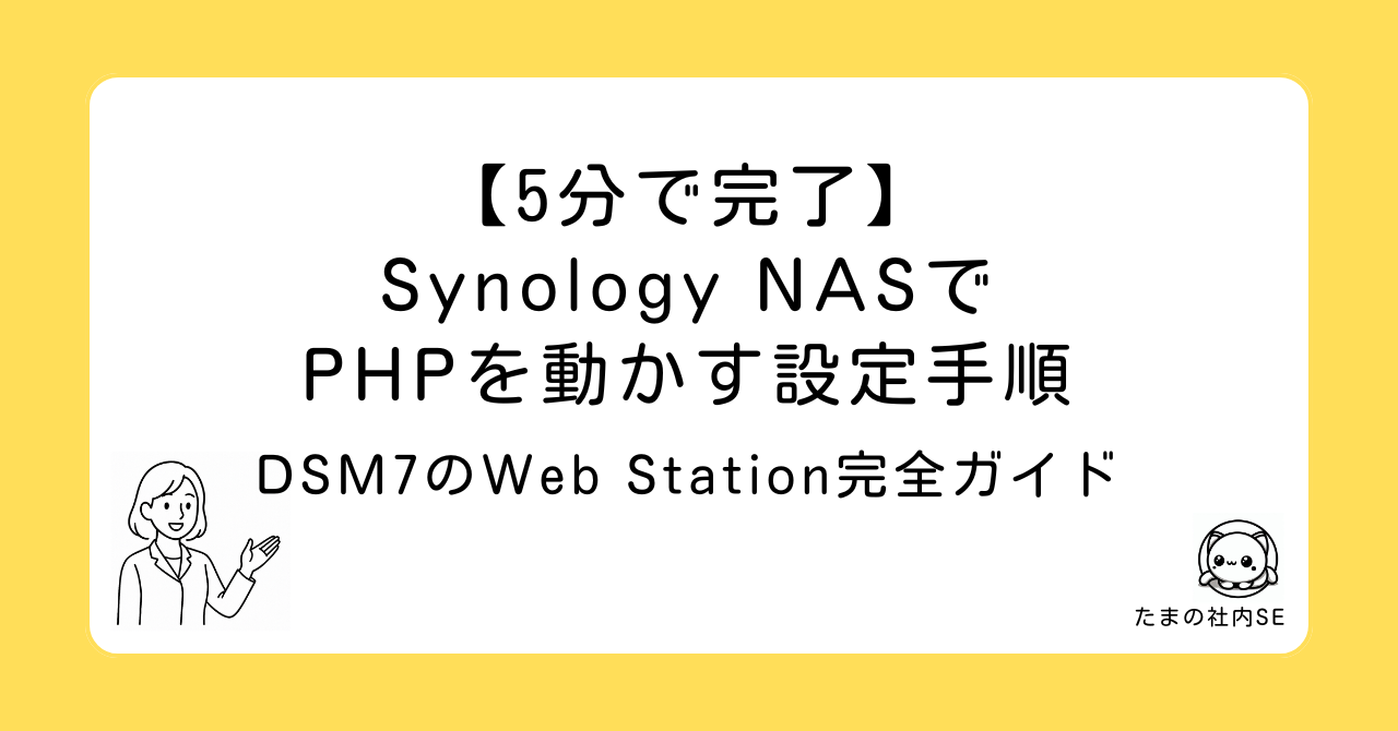 この記事では、DSM 7.3.1(DS225+)環境で実際に確認した設定手順を解説します。社内システム用にWordPressや独自のPHPアプリケーションを動かしたい方、月額費用のかかるレンタルサーバーの代わりにNASを活用したい方の参考になれば幸いです。所要時間は5分程度で、特別な知識がなくても完了できます。